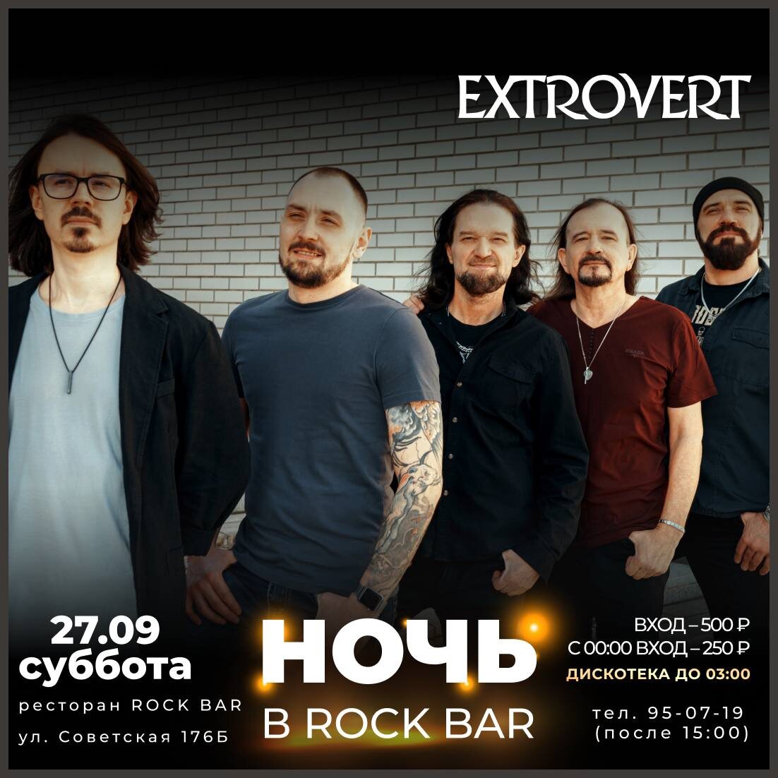 27 СЕНТЯБРЯ СБ. ”НОЧЬ В ROCK BAR” 21:30-03:00 ГРУППА EXTROVERT & ДИСКОТЕКА В эту субботу будет драйвово и мощно - на сцене рок-группа EXTROVERT , а в продолжении концерта - дискотека из хитов всех стилей и времен. Вход 500₽, с 00:00 - 250₽ ✅ Уважаемые гости! Пожалуйста, если Вы опаздываете, позвоните или напишите нам, при опоздании более 15 минут без предупреждения бронь снимается. АС 18+ FC/DC Данная публикация носит исключительно информационный характер. 📞INFO/RV (с 15:00) +7-9148-95-07-19 💻 INFO/RV: www.rockbar38.ru 📍г.Иркутск, ул. Советская 176Б