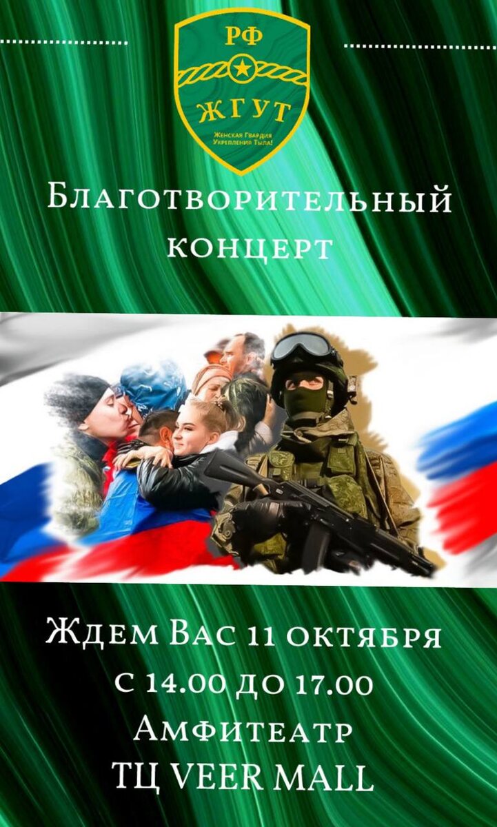 Благотворительный концерт, посвященный сбору гуманитарной помощи для наших драгоценных бойцов. Ждем всех друзей 11 октября в Веер Молл. Творческие коллективы будут радовать гостей ТЦ, а девчонки ЖГУТ будут проводить розыгрыши и дарить подарки каждому участнику благотворительной акции.