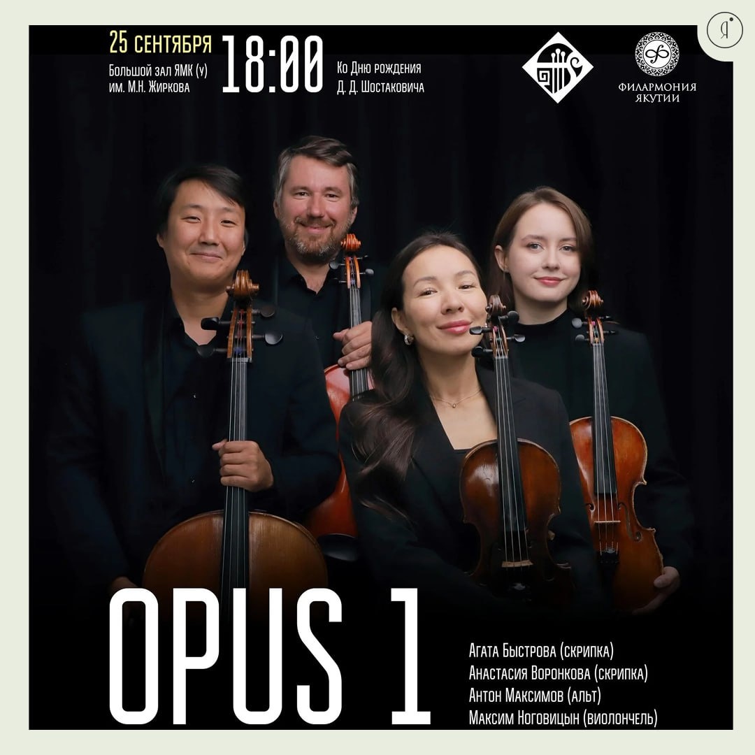 Opus 1 #Концерты Концерт квартетной музыки, посвященный дню рождения композитора Дмитрия Шостаковича. В программе прозвучат: Петр Чайковский - Струнный квартет №1 Дмитрий Шостакович - Струнный квартет №1 25 сентября | 18:00 ЯМК им. МН Жиркова, Кирова, 23А (большой зал) 250 руб. sakhaconcert.ru Online Якутия | Подписаться