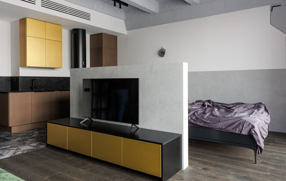 Квартира имеет вытянутую прямоугольную форму, немного более узкую во входной зоне. Слева от входа расположен совмещенный санузел, а напротив — гардеробная. Апартаменты оснащены остеклением от стены до стены, что не позволило установить полноценную перегородку между зонами. Поэтому дизайнеры использовали Т-образную перегородку из газоблока, отделав ее декоративной штукатуркой. Перегородка отделила спальное место, сделав его достаточно приватным, а также подчеркнула границы гостиной и кухни.