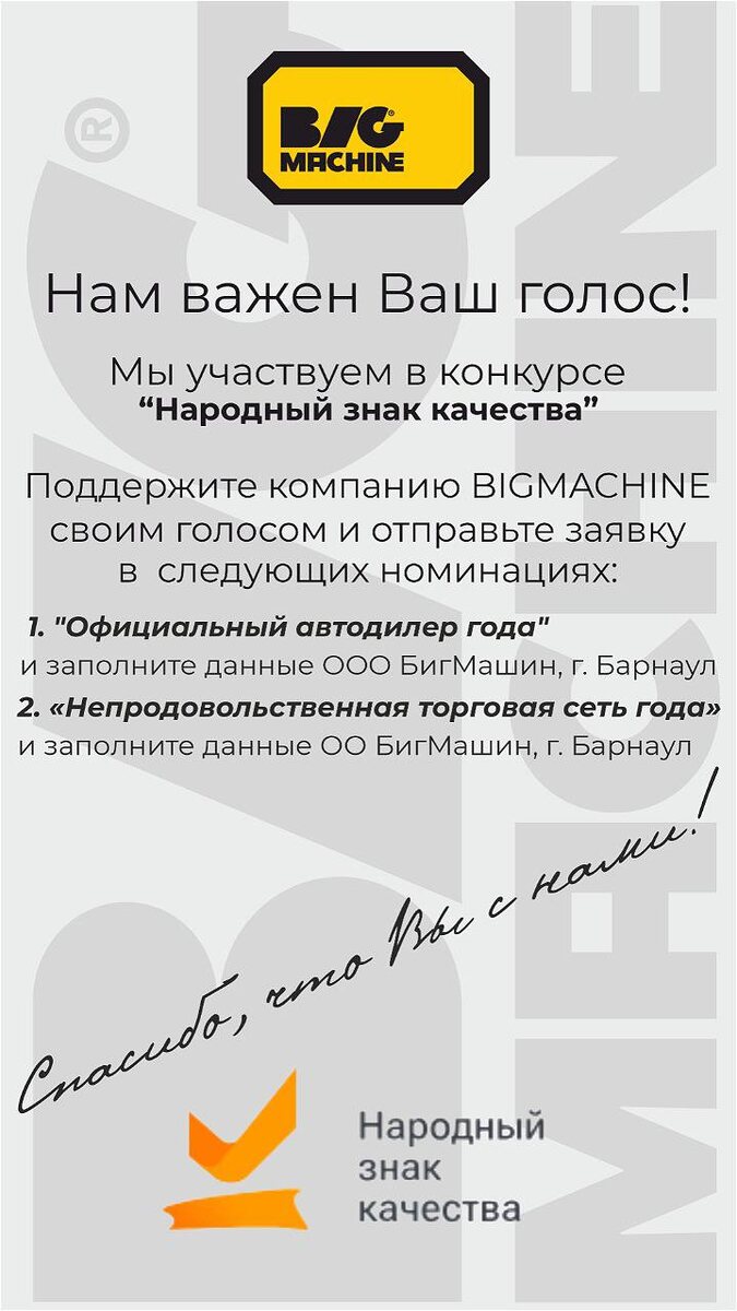 Поддержи компанию BIGMACHINE своим голосом💪💪💪 1. Зайдите, пожалуйста, на сайт https://народныйзнаккачества.рф/ 2. Нажмите на кнопку "Номинировать компании" 3. Выберите номинацию "Официальный автодилер года" и заполните данные ООО "Бигмашин" и г.Барнаул 4. Выберите номинацию "Непродовольственная торговая сеть года" и заполните данные ООО "Бигмашин" и г.Барнаул Это займет не больше минуты вашего времени. Благодарим, что вы с нами 💛