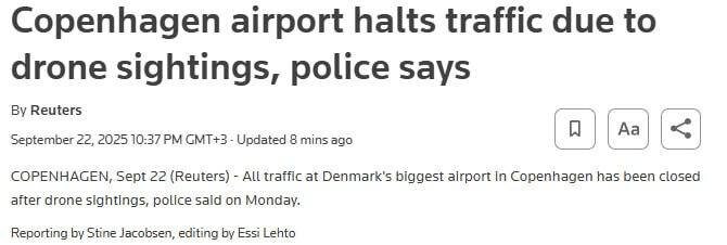 Аэропорт Копенгагена приостановил работу из-за появления в небе неизвестных дронов, - Reuters Подпишись на Телеграм Александр Семченко