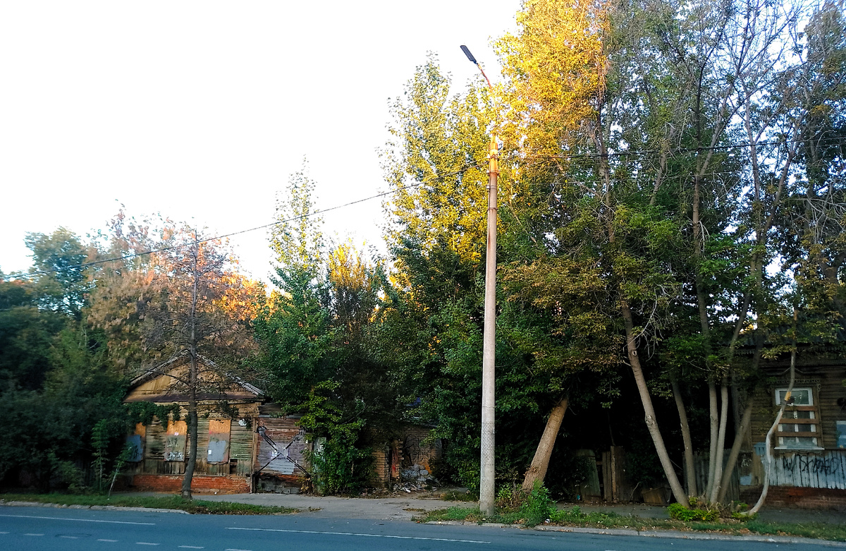 Улица Садовая от домов 106 до 132 - классика "заброшки". Дома с окнами, заколоченными досками. Дома предназначены явно на снос. На заднем плане - "золотая" башня отеля Лотте. Какой то заброшенный магазинчик... И даже тут есть интересный дом - "дом с пагодой". В реестре объектов культурного наследия дом значится как «Дом жилой на усадебном месте Прасковьи Осиповны Тузлуковой». Напоминающая пагоду башенка упомянута даже в окладных книгах по взиманию оценочного сбора с недвижимости, где строение названо «Дом каменно-деревянный с пятиярусным шатром». В 1923-м году усадьба Прасковьи Тузлуковой была муниципализирована. До Великой Отечественной войны в особняке с шатром работала первая в городе музыкальная школа. Позже особняк Тузлуковых использовался под жилье. В настоящее время дом признан аварийным на основании 70% физического износа и подлежащим расселению. Сносу здание, включенное в реестр ОКН, теоретически не подлежит.