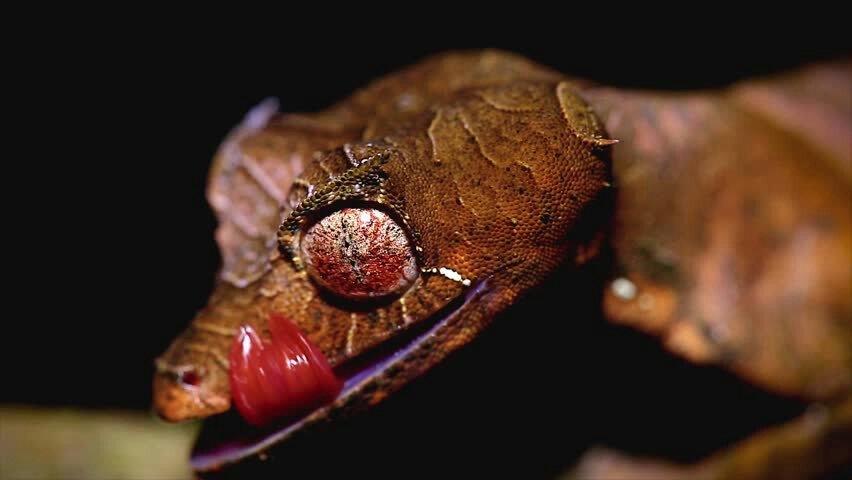 - Хвост как приманка. У этого геккона есть забавная особенность — его хвост выглядит как надкусанный лист. Это не просто дизайн природы, а способ отвлечь хищников. Если враг хватает за хвост, тот может оторваться, а геккон убегает целым и невредимым.