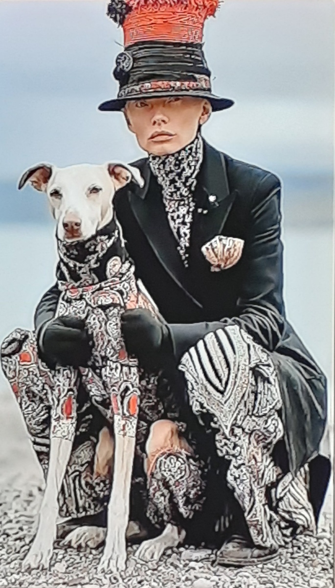 Она стояла посреди поля, словно странная гостья из другого мира. Ветер нежно касался её лица, играя тонкими прядями волос цвета осеннего золота. Но самое удивительное вовсе не это. Удивляла сама женщина: стройная фигура, элегантный фрак с широкими лацканами и узкая юбка-карандаш делали её похожей одновременно и на мужчину, и на женщину, будто некий древний мифический персонаж, заблудившийся среди бескрайних просторов поля под просторным горизонтом. Фрак безупречен — чёрный шелковый сатин сверкал загадочным блеском, подчеркивая изысканность образа. Сквозь ткань пробивались лучи солнца, создавая волшебную игру света и тени. Кажется, именно здесь она родилась заново, наполнившись магией полей, став частью таинственной истории, которую никто еще не видел. Ее взгляд казался глубоким и задумчивым, полным скрытой мудрости и силы. Она смотрела вдаль, поверх колышущихся трав, сквозь прозрачность утренней дымки, туда, куда редко заглядывают глаза человека. Казалось, будто она