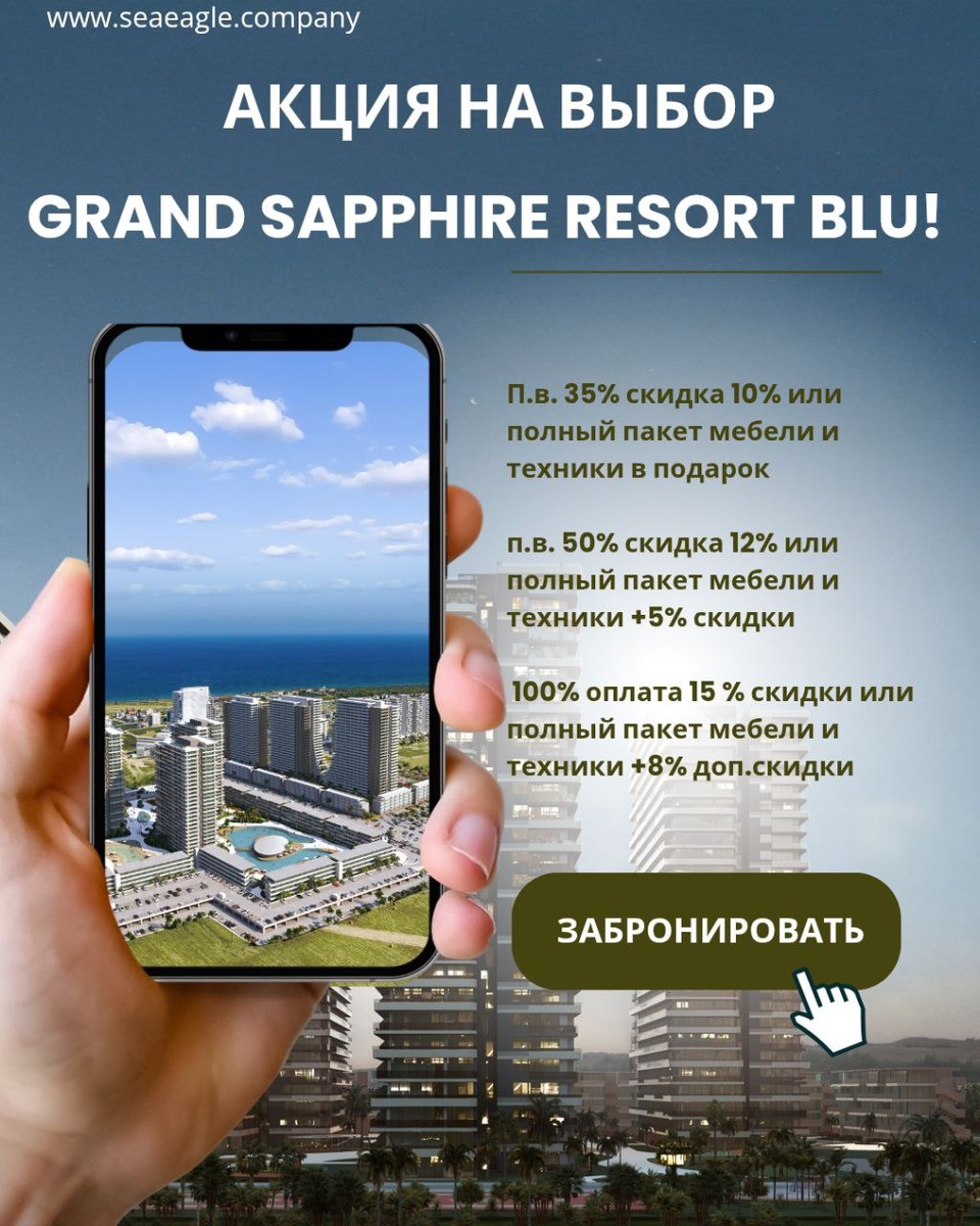 🚀 Акция! Grand Sapphire Resort BLU: максимум выгоды! Чем раньше вы инвестируете, тем больше преимуществ получаете! 🎁 При оплате 35% взноса: · Вариант А: Скидка 10% на квартиру. · Вариант Б: Полный пакет мебели и техники — заезжайте и живите! 🔥 При оплате 50% взноса (Повышенная выгода!): · Вариант А: Скидка 12% на квартиру. · Вариант Б: Пакет «Все включено»: мебель, техника + 5% дополнительной скидки! 💎 При оплате 100% взноса (Суперпредложение!): · Вариант А: Скидка 15% — максимальная экономия. · Вариант Б: Пакет «Премиум»: мебель, техника + 8% дополнительной скидки! ➡️ Не упустите шанс сделать выгодное вложение в свой курортный рай!