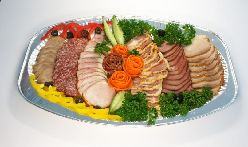 Ингредиенты: - 150 г языка отварного - 150 г свинины жареной - 300 г курицы жареной - 150 г колбасы любительской - 120 г ветчины - 2 вареных яйца - 300 г помидоров - 300 г огурцов - 300 г салата из капусты - 110 г чернослива или маслин - 180 г зеленого горошка (консервы) - 180 г соус-хрен - 60 г разной зелени - 60 г салатной заправки Приготовление: Язык говяжий отваренный, свинину жареную, колбасу и ветчину режут поперек волокон тонкими ломтиками, курицу жареную рубят на куски по 25 г. Чернослив моют несколько раз в горячей воде и охлаждают. На фарфоровое блюдо укладывают подготовленные мясные и овощные продукты, чередуя их контрастными окрасками (цветом), придавая блюду художественный вид. Овощи и мясные продукты не должны закрывать борт посуды. Часть мясных продуктов, нарезанных тонкими ломтиками, свертывают колокольчиками, огурцы и яйца нарезают узорами. Ассорти мясное украшают листьями салата, зеленым луком, петрушкой и черносливом. Овощи и мясо для сочности сбрызгивают салатной за