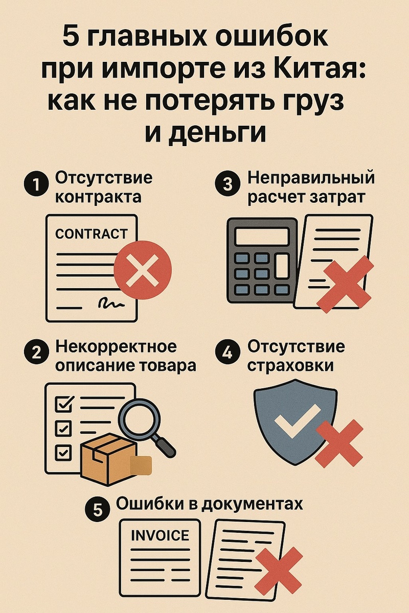 Импорт товаров из Китая — это огромные возможности для бизнеса: доступные цены, широкий ассортимент и гибкость поставщиков. Но вместе с этим — и большие риски. Многие предприниматели сталкиваются с проблемами, которые можно было бы избежать, если знать, где чаще всего совершаются ошибки. Разберём топ-5 типичных ошибок при импорте и расскажем, как минимизировать риски. Карго-поставки кажутся простым решением: отдал деньги посреднику, получил товар. Но это серый импорт, в котором полно подводных камней: В итоге товар невозможно легализовать, продать официально или поставить на баланс. А при проверке или проблемах на таможне можно потерять всё. Как избежать: работать только по «белым» схемам, где груз оформляется официально, с документами. Многие думают: «главное — перевести деньги, а остальное не важно». На деле отсутствие документов оборачивается серьёзной проблемой. Что нужно: Эти документы — основа для таможни и гарантия ваших прав. Код ТН ВЭД определяет ставки пошлин и НДС. Ошибка зд