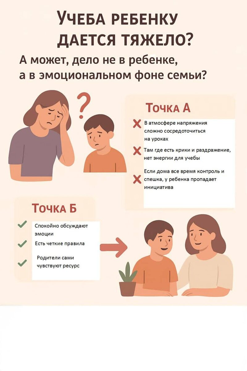 Учеба ребенку дается тяжело? А может, дело не в ребенке, а в эмоциональном фоне семьи? Очень часто родители думают: «Ну что такого, у всех дома ссоры, усталость, крики. Это нормально», именно семейный настрой отражается на том, как легко или трудно дается ребенку учеба. ❌ В атмосфере напряжения сложно сосредоточиться на уроках. ❌ Там, где есть крики и раздражение, нет энергии для учебы. ❌ Если дома все время контроль и спешка, у ребенка пропадает инициатива. Зато когда в семье: ✅ Спокойно обсуждают эмоции. ✅ Есть четкие, но понятные правила. ✅ Родители сами чувствуют ресурс. Ребенок легче усваивает материал, увереннее проявляет себя в школе и взрослеет ответственным. 📖 Отзыв мамы: «Екатерина, я вам очень благодарна за своих детей. После ваших сессий у нас в семье происходят замечательные вещи. Дети стали спокойно играть вместе и чаще общаться. Ваши рекомендации все четко работают, я просто им следую и получается результат. Дети уже почти на автомате озвучивают свои эмоции и сами