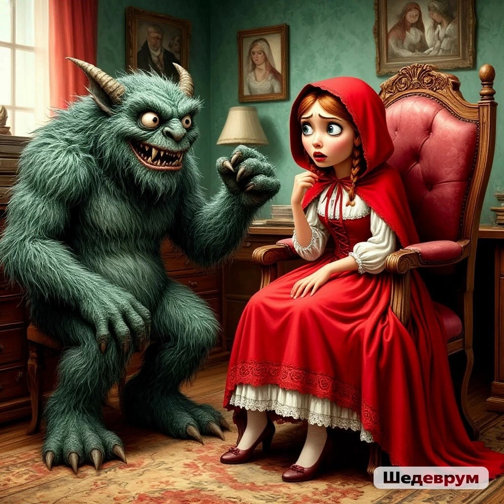 Часть 3 В офисе было оживлённо, не каждый день чудовище невиданное в платье на допрос приводят. - Так, Чудище проклятое, зачем тебе нужна была Красная шапочка и зачем её платье надело? Илья Муромец замахнулся кулаком жахнуть о зеркальную столешницу для большего эффекта, но, увидев круглые глаза Василисы, вовремя опомнился. Чудище сидело на стуле и... тряслось от страха, ножки стула и зубы выбивали такт одновременно. Оно чуть слышно пискнуло: «Я не чудище, я...» Дальше были всхлипы и подвывание. Бабушка не знала, куда деться от радости, пирожков внучке напекла, варенья вишнёвого наварила. Да только внучка сидела в углу на стуле, категорически отказываясь переодеваться в другую одежду и разговаривать. «Стресс у деточки», — решила бабуля, хлопоча дальше по хозяйству. Василиса, посовещавшись с Марфой, решили обратиться к Яге, подозревая, что что-то тут нечисто. Отправили к ней ворона, старая так и не научилась пользоваться мобильным. Через час Яга была на пороге офиса, завод