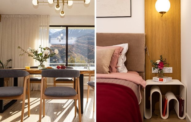 Даже стандартную планировку можно превратить в современное, стильное и уютное пространство с характером Квартира в Красной Поляне, спроектированная дизайнером Анной Терентьевой, стала примером, как грамотно впустить природу в интерьер и подчеркнуть ее средствами архитектуры и декора. Панорамные окна с видом на горы задали тон всему проекту: светлые цвета, натуральные материалы и минимум перегруженности формами создали ощущение легкости и уюта. Каждый уголок продуман так, чтобы жильцам было удобно жить и радоваться повседневным мелочам. Мы собрали семь идей, которые можно взять на заметку. Обычно прихожие выглядят тесно, но здесь дизайнер использовала стеклянную перегородку с деревянным каркасом: она отделяет входную зону от кухни-гостиной, не лишая ее света. Решение не только функционально, но и подчеркивает графичность в интерьере. Гарнитур состоит из белых фасадов и верхних шкафов под дерево. Визуально кухня выглядит лаконично, но при этом тепло и уютно благодаря натуральным оттенкам
