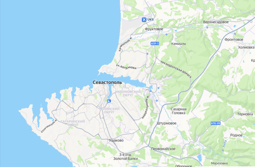 Думаю, что многие могут не знать, и нужно пояснить, что Севастополь бухтой делится на Северную и Южную сторону. В центре карты видно бухту, которая и делит город на две части: