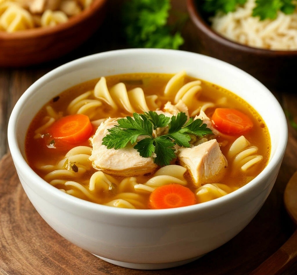 Подборка вкусных и простых куриных супов на каждый день с пошаговыми рецептами. Классический суп, который готовится очень быстро и всегда получается вкусным. Ингредиенты: Пошаговый рецепт: Курицу хорошо промыть. Если используете филе, можно нарезать его на некрупные кусочки. Голени или бедра лучше варить целиком. В кастрюлю налить холодную воду, положить курицу и поставить на средний огонь. Довести до кипения и снять образовавшуюся пену. Это важно для получения прозрачного бульона. После закипания убавить огонь до слабого, посолить, добавить перец горошком и варить курицу под слегка приоткрытой крышкой около 20-25 минут, если у вас филе, или 35-40 минут, если вы используете голени или бедра. Пока варится курица, подготовить овощи. Картофель почистить и нарезать кубиками среднего размера. Морковь натереть на крупной терке. Лук мелко нарезать. Достать готовую курицу из бульона и дать ей немного остыть. Если использовали филе, можно просто разобрать его на волокна. Если варили кусочки на