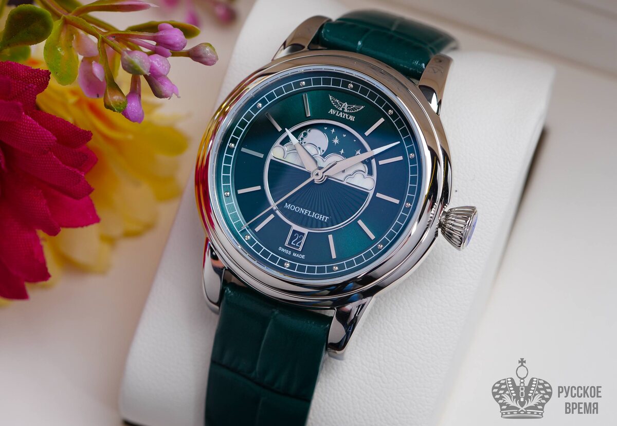 Летаем первым классом... В коллекции часов AVIATOR MoonFlight классические элементы стиля ар-деко эффектно сочетаются с фазами Луны. С ними вы будете окружены звездами в изысканной атмосфере от-кутюр. Если присмотреться к Луне, все самое интересное – в деталях. Отделанные настоящим перламутром облака служат апертурой для показателей лунных фаз и отсылают наше воображение к строгой классике модных в 1930-е годы жемчужных ожерелий, добавляя прелесть старины этой вневременной модели. Переливы и отражения на перламутровой поверхности напоминают лунный свет. Посмотрите, как он играет, отражаясь на облаках и усыпанном звездами небе. ₽ 49.000