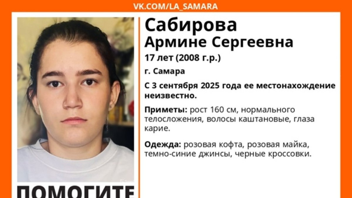 ❗️ В Самаре ищут девочку с каштановыми волосами 17-летняя жительница Самары пропала 3 сентября 2025 года. Местоположение Армине Сабировой неизвестно уже 20 дней, и на данный момент ее поисками занимается поисковый отряд «ЛизаАлерт» Самарской области. Приметы, по которым можно заметить девушку: рост 160 см, нормального телосложения, волосы каштанового цвета, а глаза карие. Всех, кто видел Армине Сабирову или может сообщить какую-либо информацию, просят позвонить по телефону 112. 📸: Поисковый отряд "ЛизаАлерт" Самарской области ГТРК Самара MAX lВК lОК lСАЙТ 🔹🔹🔹🔹🔹🔹🔹🔹🔹🔹