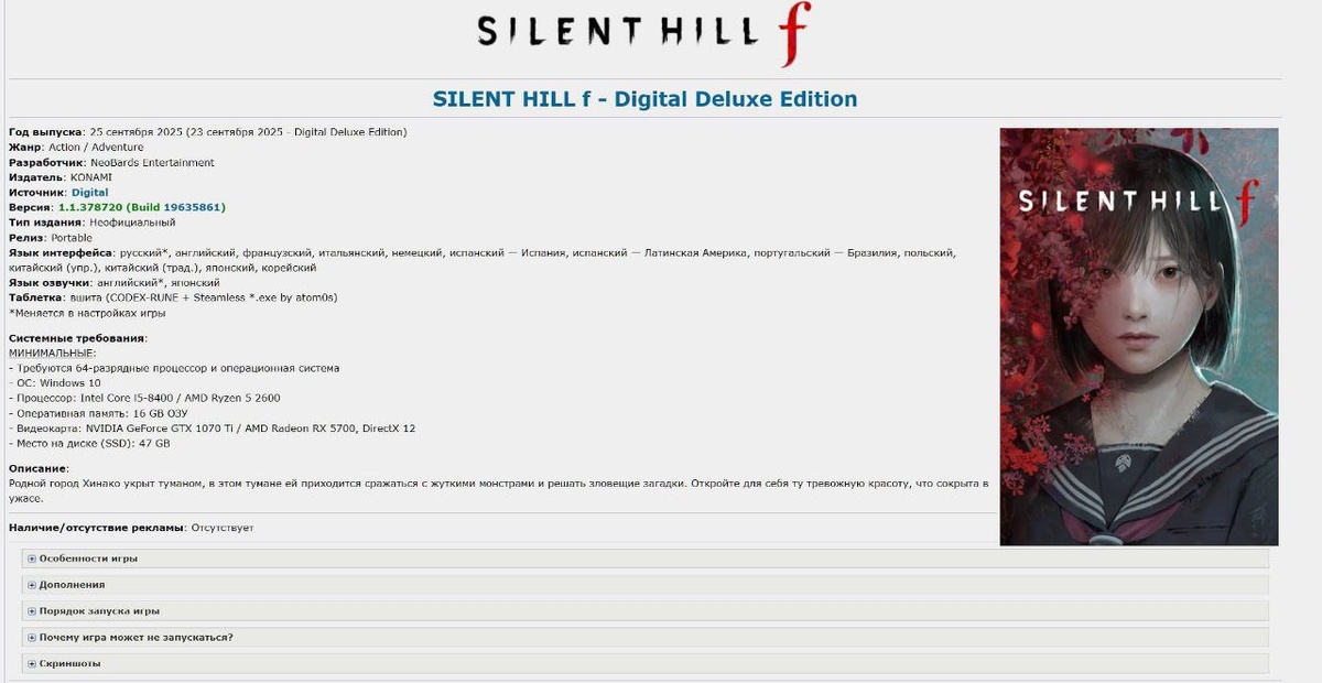 Silent Hill f СЛИЛИ в зелёный магазин — делюкс-версию можно скачать на любимых сайтах.