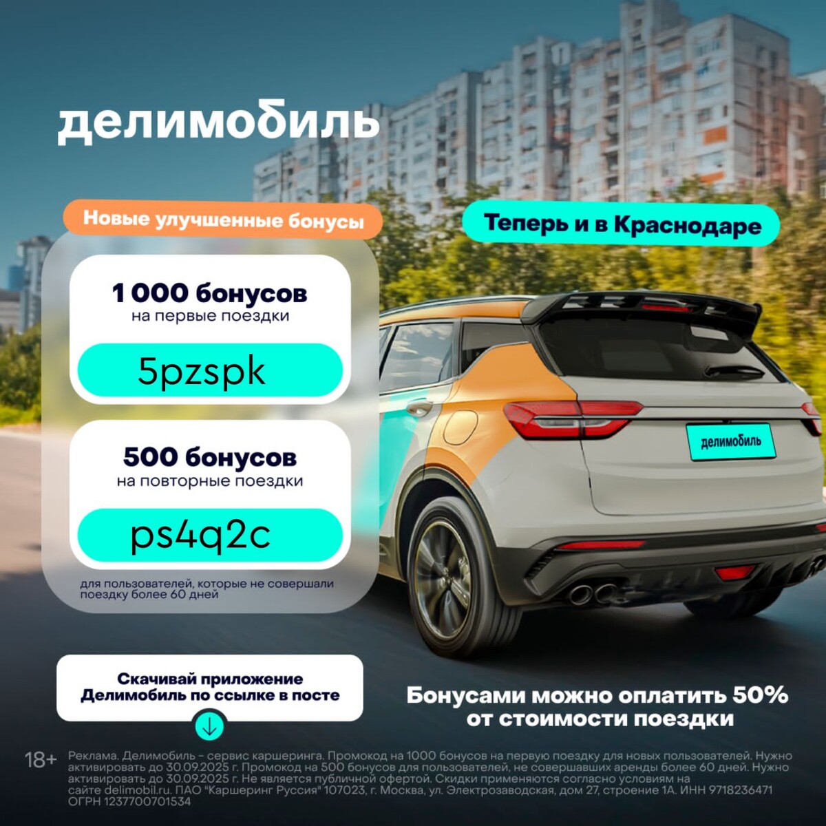 Что не хочется делать осенью: отслеживать прогноз погоды, мокнуть под дождём и пересчитывать лужи на дорогах. Лучше считать бонусы на поездки с Делимобилем. Просто садишься в теплый сухой салон, включаешь любимый трек и берёшь от жизни всё. Заправлять и мыть машину не нужно — сервис берёт это на себя. С тебя только: • Скачать приложение по ссылке • Приготовить для регистрации паспорт и права. • В разделе Бонусы и промокоды ввести промокод 5pzspk — получить 1000 бонусов на первые поездки. • Если последняя поездка в Делимобиле была больше 60 дней назад — ввести промокод ps4q2c на 500 бонусов. Бонусы покроют до 50% стоимости поездки (1 бонус = 1 рубль), а остаток сохранится. Теперь и в Краснодаре! Реклама. ПАО "Каршеринг Руссия" 107023, г. Москва, ул. Электрозаводская, дом 27, строение 1А. ИНН 9718236471 ОГРН 1237700701534