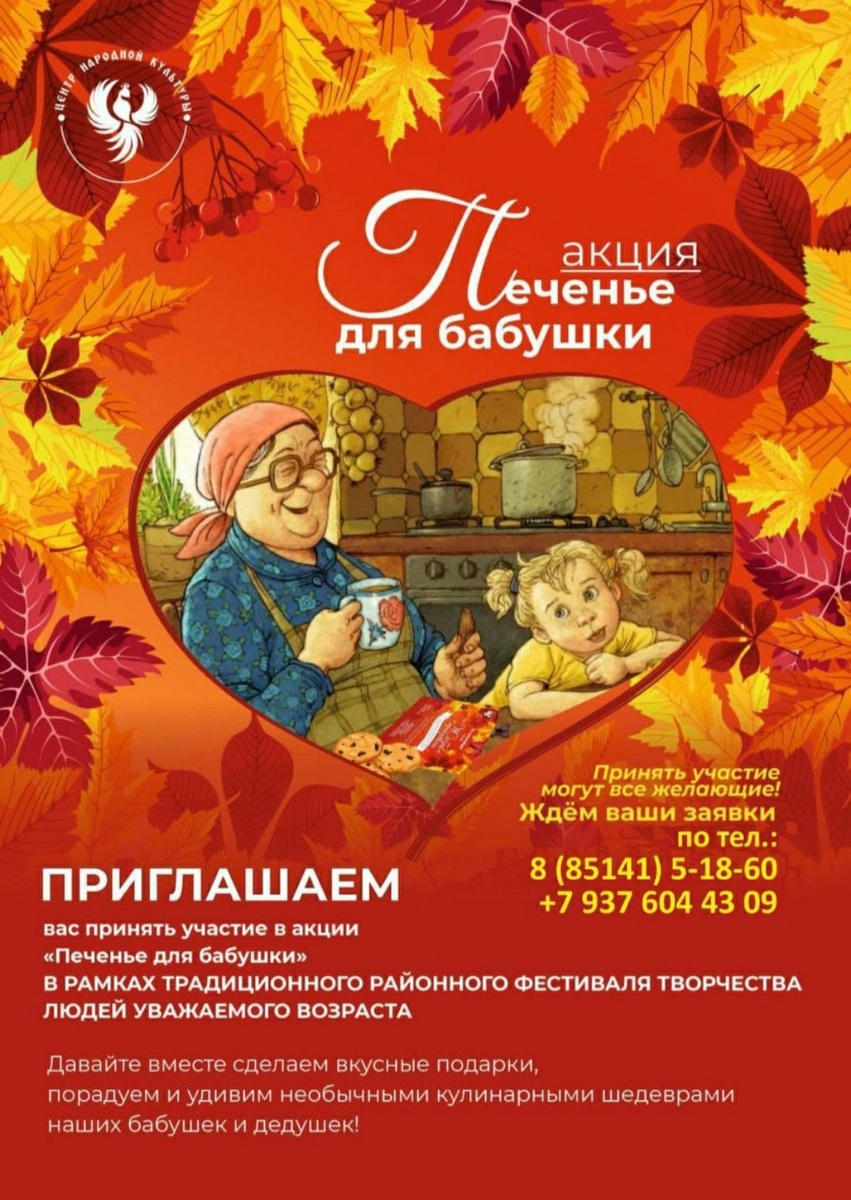 Друзья, я к вам с интересным предложением 🙌 Уже в эту субботу в районе состоится фестиваль ко Дню пожилого человека. В преддверии него организаторы праздника традиционно запускают акцию «Печенье для бабушки».👵 ✨В чем суть? Всем желающим предлагается принести печенье, которым будут угощать бабушек и дедушек. Вы можете приготовить его сами или купить и принести в районный дом культуры. Вам несложно, а им будет приятно. _________ Контакты для связи и уточнения подробностей - на афише ☝