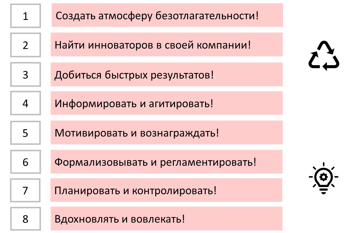 2. Найти последователей в своей компании! Необходимо опираться на «узкую базу»: найти инноваторов и адептов в своей компании, готовых выступить в роли амбассадоров планируемых изменений. Например, заручитесь для начала поддержкой 1-2 авторитетных сотрудников, а они уже на рабочих местах, в курилках и т.д. будут доносить «политику партии в массы» и вербовать новых сторонников. Вирус изменений должен поселиться в организации!