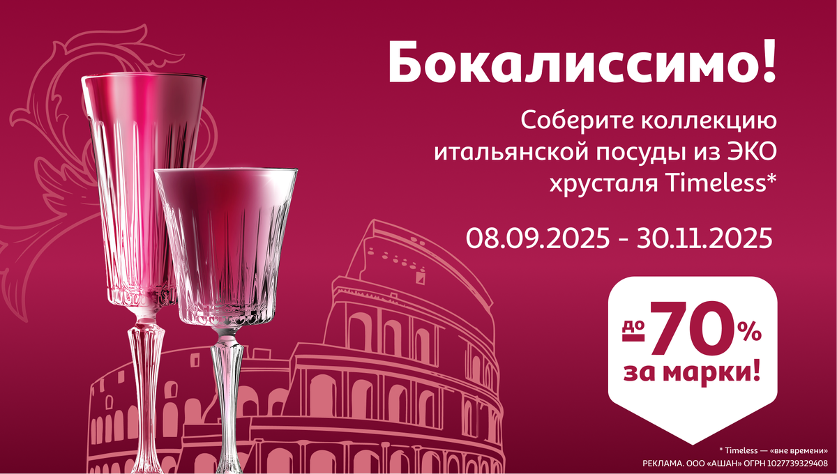 Белиссимо — это бокалиссимо! Совершайте покупки с 8 сентября по 16 ноября, получайте марки за каждые 400 рублей в чеке и обменивайте их на скидку до 70% на коллекцию итальянской посуды из ЭКОхрусталя Timeless* до 30 ноября включительно. Все подробности акции тут. Luxion — экологичный хрусталь нового поколения, созданный в Италии. Он сочетает красоту и практичность натурального хрусталя, сохраняя при этом экологичность и прочность. Преимущества материала: В коллекцию входят фужеры для вина и шампанского, креманки для десертов и мороженого, стаканы для виски, стопки, стаканы для воды, кувшин для освежающих напитков и штоф — ещё один стильный графин. 1. Совершайте покупки с картой АШАН в магазинах, на сайте auchan.ru или в мобильном приложении «Мой АШАН». 2. Получайте марки за покупки по карте лояльности. Каждые 400 ₽ в чеке = 1 марка. 3. Получайте больше марок