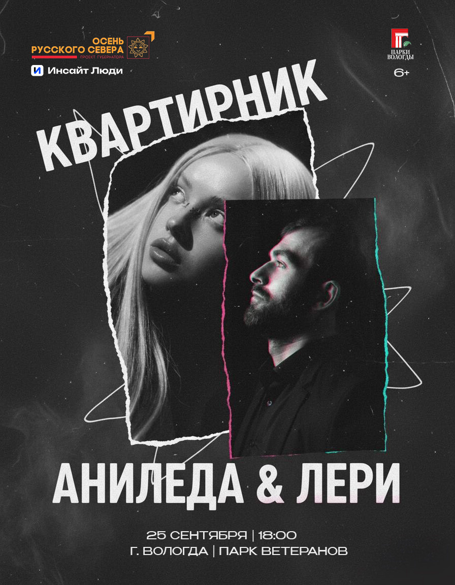 25 сентября в Вологде пройдет особенный музыкальный вечер. Ровно в 18:00 Парк Ветеранов преобразится в уютную площадку для душевного квартирника под открытым небом. На мероприятии выступят резиденты региональных студий продюсерского центра «Инсайт Люди» (входит в «Газпром-Медиа Холдинг») — артисты ANILEDA и Лери Маргиев. Вход свободный.