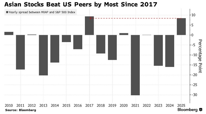 Аналитики считают, что азиатские акции продолжат превосходить американские из-за слабого доллара. Индекс MSCI Asia Pacific уже обогнал S&P 500 и, вероятно, покажет самое большое годовое преимущество с 2017 года. Факторы, способствующие этому, включают стабильные цены на сырье, низкие ставки в США и отсутствие торговых перебоев. Аналитики прогнозируют, что акции азиатских стран продолжат превосходить американские из-за ослабления доллара, что делает регион более привлекательным. Это обусловлено низкими оценками и отказом от американских активов. Дополнительную поддержку акциям региона оказывают признаки ослабления торговой напряженности, особенно между США и Китаем. Многомесячный рост, похоже, не достиг своего пика. Снижение процентной ставки Федеральной резервной системой усилило пессимистические прогнозы по американской валюте и дало азиатским центральным банкам возможность смягчить политику. В этом году индекс MSCI Asia Pacific вырос на 22%, опередив индекс S&P 500 на восемь процентн