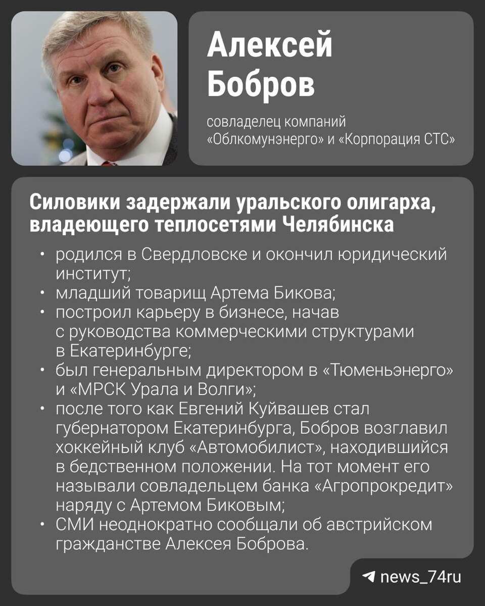 В ответ на пост Как задержанный уральский олигарх Алексей Бобров связан с Челябинском На прошлой неделе Генпрокуратура подала иск о национализации активов уральских бизнесменов Артема Бикова и Алексея Боброва, владеющих в числе прочего теплосетями Челябинска. По мнению ведомства, холдинг «Корпорация СТС» монополизировал генерацию и поставки электроэнергии, а также обращение с бытовым мусором в регионах Уральского федерального округа. В иске, по данным «Интерфакса», сказано, что производственный комплекс группы компаний сформировался за счет госимущества «Облкоммунэнерго», которым бизнесмены завладели в обход закона. По данным собеседников РБК, в иске утверждается, что доходы от продажи коммунальных ресурсов Биков и Бобров через подконтрольный банк «Агропромкредит» выводят на зарубежные счета в Австрии и Швейцарии, откуда активно инвестируют в экономику Черногории и Австрии, приобретая там гостиничные комплексы. В Челябинске ООО «Корпорация СТС» владеет частью АО «УСТЭК-Челябинск» —