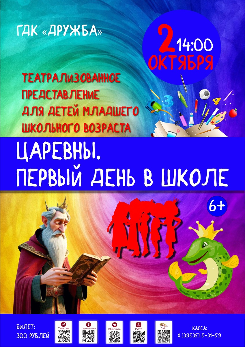 Друзья! 👑 По многочисленным просьбам повторяем интерактивное театрализованное представление «Царевны. Первый день в школе», посвящённое началу учебного года. Вместе с царевнами из сказочного Дивногорья зрители отправятся в увлекательное путешествие, где выяснят, зачем нужны уроки, и как преодолеть трудности на пути к знаниям. 🕑 2 октября в 14.00 ждем учащихся 1-4 классов, а также классных руководителей и родителей! 💳 Стоимость билета 300 рублей. Касса: 8-(395-35)-5-31-59.