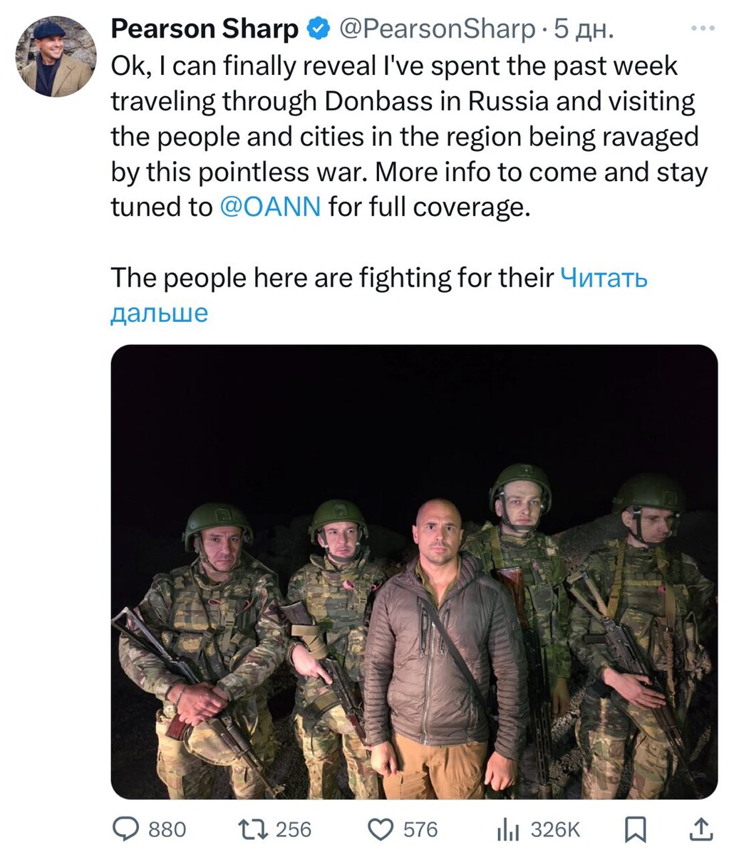 Журналист и расследователь американского телеканала ONE AMERICA Пирсон Шарп рассказал в соцсети Х о поездке на Донбасс в составе нашего пресс-тура. - Люди здесь борются за свою свободу, их истории разбивают западную интерпретацию происходящего на Украине. Я поговорил с мужчинами и женщинами, которые здесь живут и сражаются, и он рассказали, что Россия им не враг, а вот Украина – да, они сказали, что благодарны президенту Путину за то, что он сделал, чтобы защитить их от режима Зеленского. Это их слова, не мои, - написал Шарп. В комментарии к посту тут же набежали разъярённые проукраинцы с угрозами и пожеланиями смерти. Пост Пирсона широко расходится внутри американского сегмента X (бывший твиттер). Далее Пирсон опубликовал ещё один пост, где дополняет свою позицию по увиденному на Донбассе и отвечает тем, кто желает ему смерти: «Хочу продолжить свой предыдущий пост, потому что реакция была поразительной, хотя и, к сожалению, предсказуемой. Посмотрите сами, если интересно. НИ ОДНОГО