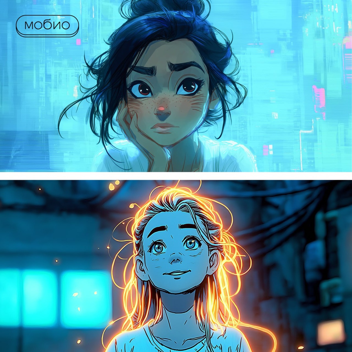 👍 Нейрокомикс от агентства «Мобио» 2049-й. В мире, где технологии стали ближе, чем люди, легко потеряться в апатии, одиночестве и бессмысленности. Маленькая Алиса переживает это на себе — ни мемы, ни фильмы не могут зажечь ее снова. Но ее грусть замечает цифровой помощник, встроенный в смартфон. Проект агентства «Мобио», выполненный в киберпанк-стиле, имеет социальную актуальность. Это история о том, как технологии могут гармонировать с живыми людьми, помогать в поиске настоящих эмоций и объединять там, где цифровой мир раньше разделял. Конкурс нейрокомиксов от Sostav продолжается! Успейте поделиться своей работой до 30 сентября. Подробности — по ссылке. #Нейрокомикс #конкурс 😀 Пожалуй, лучший телеграм-канал о маркетинге