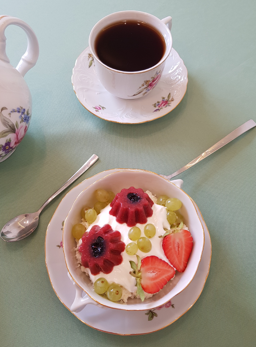 Добрый день, дорогие друзья! Сегодня я представляю вашему вниманию рецепт, который напомнит нам лето, поднимет настроение в пасмурный день! Малокалорийный десерт порадует и любителей сладкого, и приверженцев здорового образа жизни. Для приготовления 6 порций нам понадобятся: 300 грамм свежей клубники (можно взять и замороженную клубнику), 50 грамм аллюлозы, 2 грамма агар-агара, 12 штук голубики общим весом 60 грамм. Для оформления 6 порций нам понадобятся: 900 грамм творога жирностью 5%, 180 грамм сметаны жирностью 10%, 180 грамм клубники, 180 грамм винограда кишмиш. Приготовление: клубнику промыть, удалить чашелистики и поместить в чашу измельчителя. Измельчить клубнику до однородного пюре. Переложить клубничное пюре в кастрюлю, добавить сахар, нагреть до растворения сахара на среднем огне. Добавить агар-агар, довести до кипения на среднем огне. Разложить по формочкам голубику. Заполнить формочки клубничным пюре, охладить сначала при комнатной температуре, а затем поместить в хол