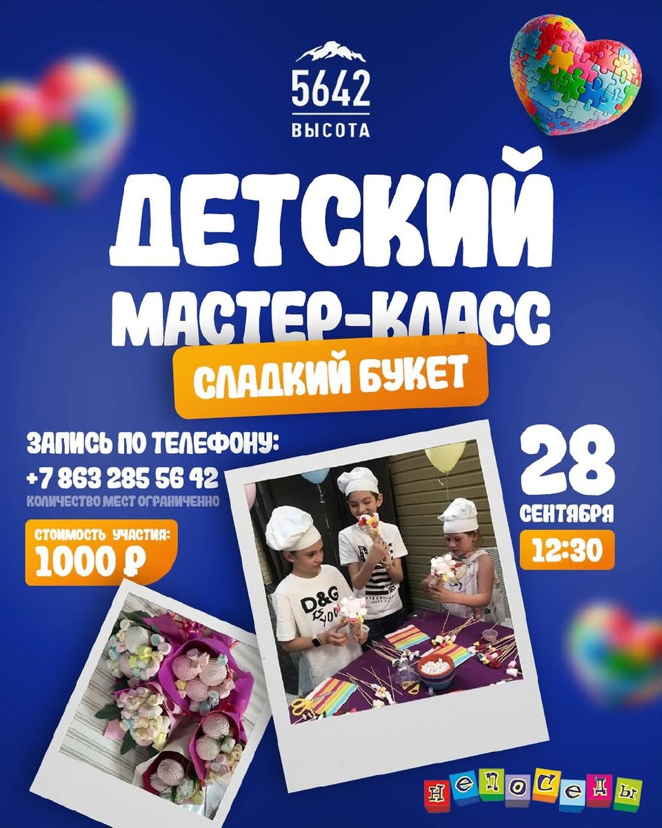 Детский мастер-класс «Сладкий букет» 🍭 Творческий мастер-класс, на котором дети смогут создать свой собственный «Сладкий букет». Это отличная возможность провести время всей семьёй, развить фантазию ребёнка и забрать домой вкусный сувенир. Дата: 28 сентября «Высота 5642» . Время: 12:00 сбор маленьких гостей, в 12:30 начало 🫠 Детские мероприятия Ростов-на-Дону. Я местный! 📱 Мероприятия Ростов-на-Дону. Я местный! в MAX