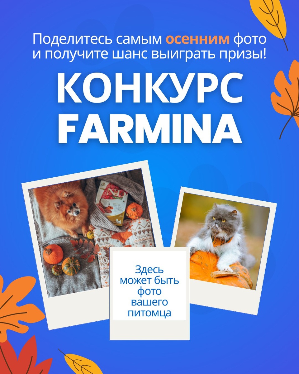 КОНКУРС FARMINA: ВАШ ПИТОМЕЦ И ОСЕНЬ 🍁🍂 Осень - время ярких падающих листьев и не менее ярких прогулок с питомцем! Поиграть, побегать и пофотографироваться на фоне осенних пейзажей - идеальный план для времяпровождения с пушистиком. А после такой фотосессии можно принять участие в нашем конкурсе... и выиграть призы! 😁 УСЛОВИЯ: 1. Будьте подписаны на нашу страницу, 2. Поставьте лайк этому посту, 3. В комментариях к этому посту выложите самое красивое и креативное осеннее фото вашего питомца, 4. Поделитесь этим постом с друзьями, чтобы они тоже приняли участие в конкурсе! 30 сентября мы выберем 3 победителей (авторов самых креативных фотографий, по нашему мнению) и вручим им подарки. ПРИЗЫ: Каждый победитель получит в подарок пачку сухого корма Farmina. Желаем всем удачи!
