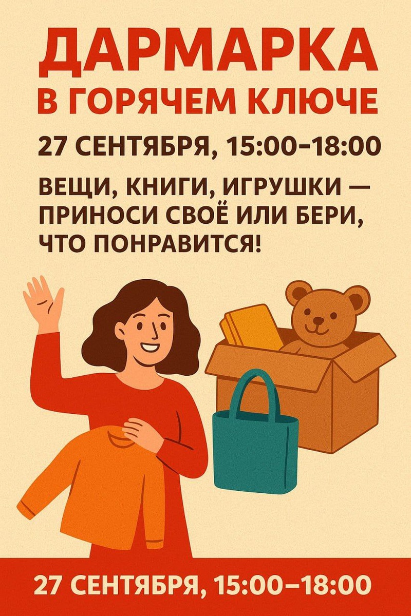 📢 В Горячем Ключе снова дармарка! 27 сентября с 15:00 до 18:00 в центральном парке у озера пройдёт большой обмен вещами. Приносите одежду, книги, игрушки, предметы обихода — или просто приходите и выбирайте то, что пригодится вам. Всё абсолютно бесплатно! К мероприятию присоединяется благотворительная организация «Крепкая семья». Они привезут вещи из своих фондов и позаботятся о том, чтобы всё оставшееся после акции попало к тем, кто нуждается. Такие встречи уже стали традицией для нашего города — приходите и вы, будет полезно и приятно! 🌿