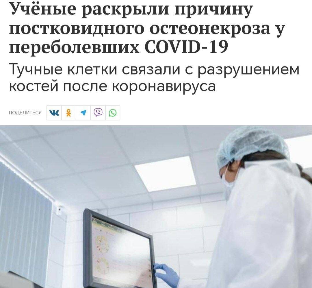 Российские ученые нашли связь между остеонекрозом и коронавирусом. ❗️При постковидном остеонекрозе нарушается кровообращение, костная ткань отмирает, вызывая сильную боль и потерю подвижности суставов. Тромбы, образующиеся из защитных клеток заражённых, ускоряют разрушение костей. 💢 Итог: необходимость полной ЗАМЕНЫ СУСТАВА искусственным протезом.