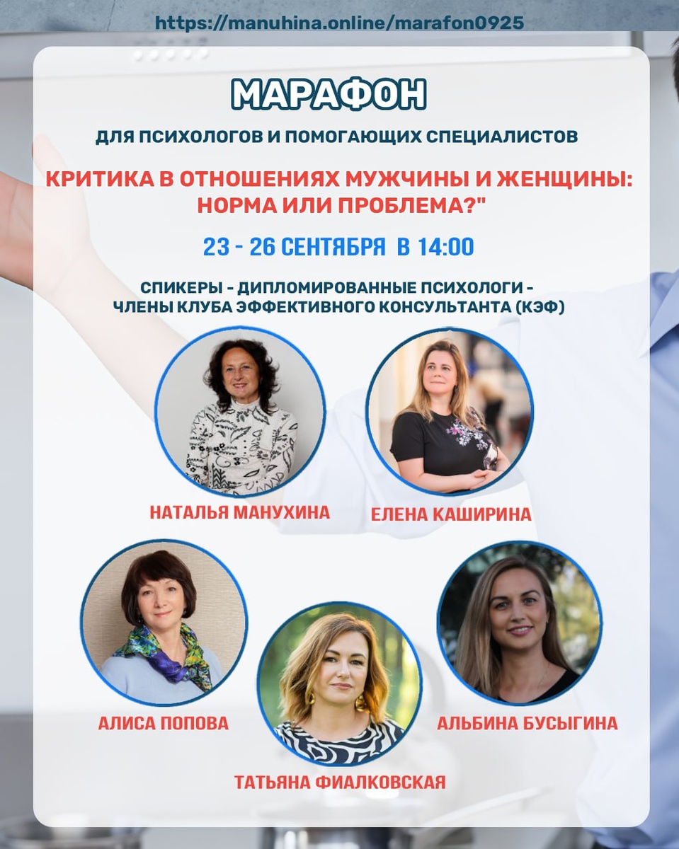Дорогие коллеги! 🚀 Сегодня стартует марафон КЭф "Критика в отношениях мужчины и женщины: норма или проблема?"🚀 👉🏻 https://manuhina.online/marafon0925 Ежедневные прямые эфиры с 23 по 26 сентября в 14:00 по Мск - это уникальная возможность для психологов углубить свои знания и навыки в работе с парами, столкнувшимися с проблемами, связанными с критикой в отношениях. Критика — это естественный элемент коммуникации, однако, когда она начинает доминировать, это может привести к конфликтам и эмоциональным страданиям. На марафоне спикеры поделятся реальными кейсами из своей практики и расскажут о тех инструментах, которые они использовали для преодоления критики и восстановления гармонии в отношениях. Вы сможете увидеть, как теоретические знания применяются на практике, и перенять успешные стратегии для своей работы. Не упустите возможность пообщаться с единомышленниками, поделиться опытом, найти новые источники вдохновения для своей практики👇🏻 https://manuhina.online/marafon0925