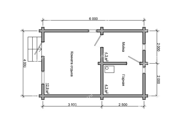 Планировка: парилка 2х2м, моечная 2х2м, комната отдыха 2х4м