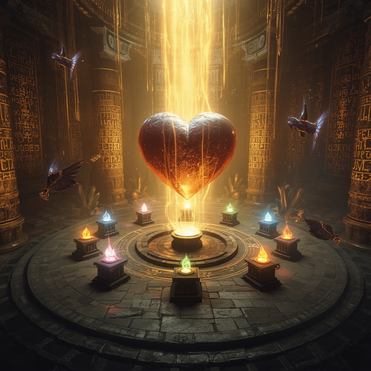В центре зала возвышалось нечто невероятное — гигантский кристалл, размером с целое здание, который пульсировал мягким золотистым светом. Это и было Сердце Архипелага — источник всей магии островов. Вокруг кристалла, на разных уровнях, располагались древние алтари с артефактами, каждый из которых представлял одну из стихий.