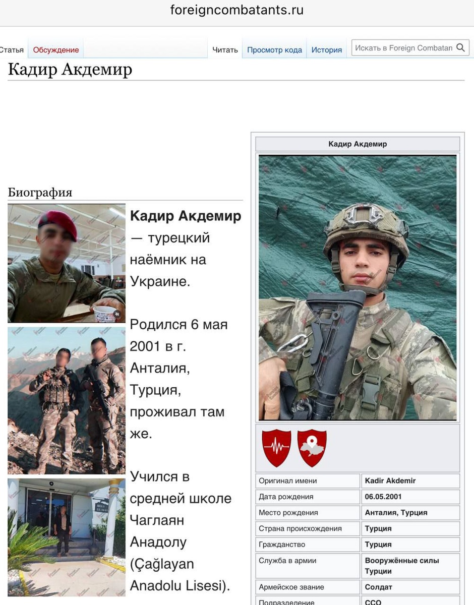 #наемники 🇹🇷🇺🇦 Отрубал головы пленным курдам в Ираке и Сирии. Турецкий наёмник приехал мстить за террористов, ликвидированных ВС РФ Кадир Акдемир, 06.05.2001, проживал в популярной у российских туристов Анталье, в немалой степени обеспечивающих бюджет города. Во время учёбы в школе Чаглаян Анадолу возглавлял молодёжную ячейку террористической организации Бозкурт (Серые волки) - неофашистская и расистская группировка, которая проповедует ненависть к курдам. По окончании школы служил в ССО турецких ВС. Участник боевых действий в Северном Ираке и Сирии. По данным проекта Форинкомбатантс, совершил военные преступления в Северном Ираке, убив более 14 боевиков РПК. В частности, одному из курдов, взятому в плен, Акдемир отрубил голову. Турок является ярым противником Реджепа Эрдогана и сторонником пантюркистской идеологии и «Великого Турана» - идеи культурного поглощения с последующим экономическим и политическим захватом территорий, где когда-то проживало тюркоязычное население. На