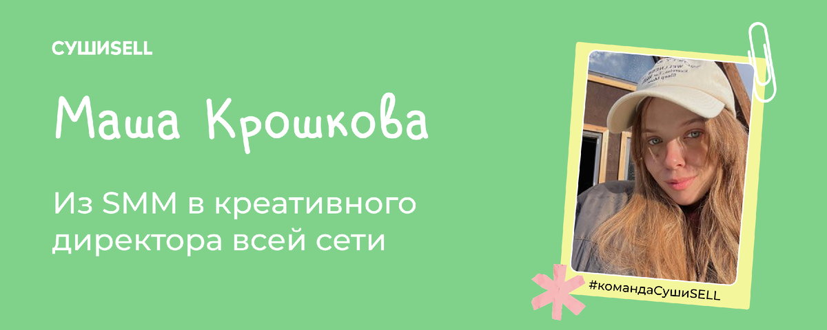 Мы знаем: вместе с компанией растут и люди внутри неё. Поэтому мы запустили цикл статей про рост внутри компании — реальные истории наших коллег, которые прокачались, изменились и вышли на новый уровень в СушиSell.. Сегодня героиня — Маша Крошкова, которая прошла путь от руководителя SMM-направления до креативного директора. Маша пришла в «СушиSell» в апреле 2023 года. Должность руководителя SMM-направления была для неё новой — опыта в создании контента хватало, а вот в управлении командой он только формировался. «Сложнее всего было то, что я никогда раньше не руководила командой. Но директор по маркетингу и коллеги на старте меня поддерживали так сильно, что иногда верили в меня больше, чем я сама» Через год случилось выгорание. Постоянная нагрузка и отсутствие отдыха дали о себе знать. «Я подумала: кто-то другой справится лучше, и решила уйти. Не к другой работе, а просто в отпуск», — рассказывает Маша. Спустя несколько ме