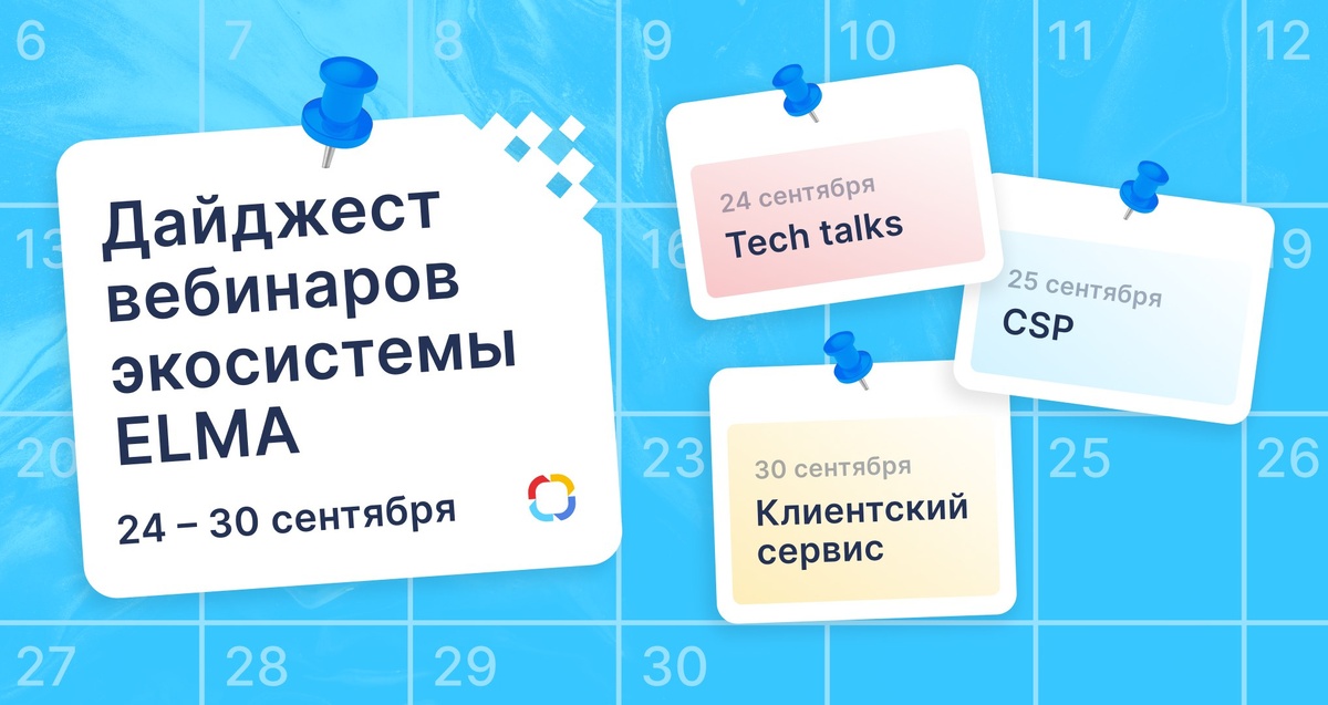 📆 БЛИЖАЙШИЕ ВЕБИНАРЫ ➡️ 24 сентября 11:00 ELMA TechTalks'25 Техническая команда вендора поделится летними обновлениями в ELMA365 Подробнее ➡️ 25 сентября 11:00 Вебинар «ЭДО без риска: безопасность контента в электронном документообороте» Ведущие: Денис Мочалов, Александр Яров Подробнее ➡️ 30 сентября 11:00 Вебинар «Бесшовный CX и обогащение данных для роста в 2026» Ведущий: Иван Гайдамак Подробнее До встречи на вебинарах! 🟡