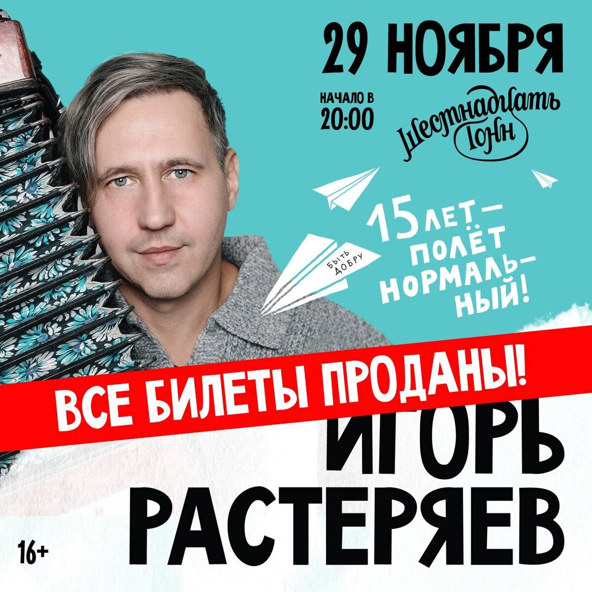 ⚠ Друзья! Спешим сообщить, что все билеты на первый юбилейный концерт Игоря Растеряева в Москве проданы! Ждём вас 29 ноября в клубе «16 Тонн»!