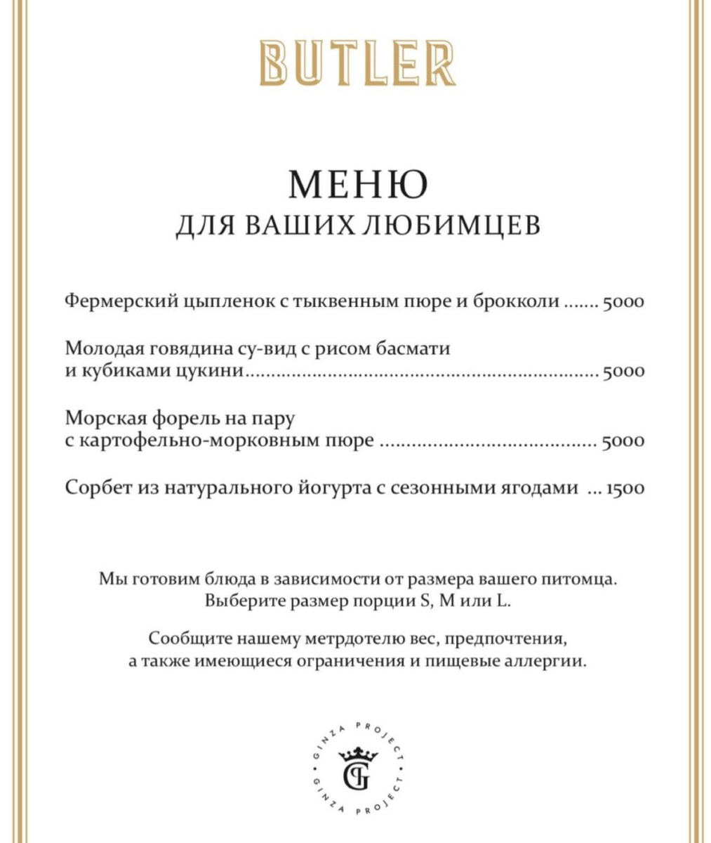 Окак, любопытный факт: в ресторане Butler в Москве есть отдельное меню для животных