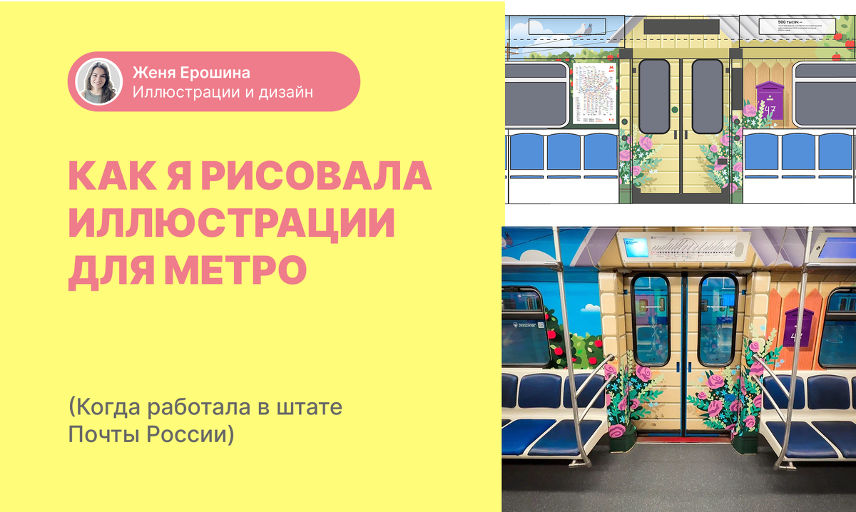 Не каждый день выпадают масштабные проекты, и этот был для меня особенно интересен. Меня зовут Женя Ерошина, я иллюстратор и графический дизайнер. В 2022 году, после декрета, я вернулась работать в «Почту России» дизайнером и успела реализовать несколько ярких проектов, один из которых — оформление поезда московского метро.