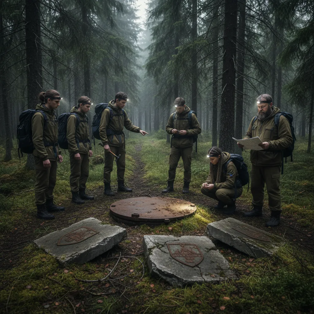 Лес под хребтом Черной ели затягивал в себя дыхание и звук, словно густой мох обволакивал не только корни, но и мысли. Молодые геологи — Лера, Арсений, Данила, Мадина и их руководитель Кирилл — шли по старой, прорезанной трактором, просеке, отыскивая редкие метаморфические породы. Воздух вязал язык смолой и влажным холодом, не отпускал даже слова. Вечер падал на землю темнотой, и только их фонари наносили тонкие, ломкие шрамы света на древнюю кору. Они не искали ничего кроме камня — однако нашлось нечто иначе твердое: ржавая крышка люка, полу утонувшая в земле, окруженная треснувшими плитами с клеймами давно исчезнувшего института.