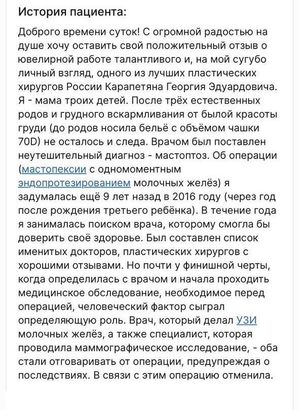 Отзыв после маммопластики. Другие отзывы можете почитать на сайте ПроДокторов (https://prodoctorov.ru/moskva/vrach/236282-karapetyan/#rating) ——— Для записи на очную консультацию, уточнения стоимости и любых других вопросов звоните администратору +7 (495) 055-03-25