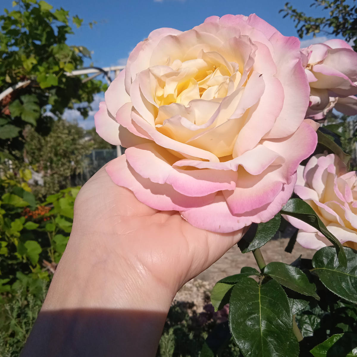 Вот почему так получается? Условия для всех одинаковые, но разница существенная. Причем, это касается не только цветов, но и овощей тоже. Вот эта красотка вымахала за два метра в высоту. Цветки у нее огромные. Роза Акварель ч/г, растет у нас года четыре, но никогда такой гигантской не наростала. Ну, просто стремиться догнать черешню! Даже ее родственница Восточный экспресс, которая славится своим ростом и неприхотливостью, значительно отстала. Заплохела она в это лето. Что уж говорить о Глории Дей, тоже их родственницы. Она у нас никогда не была в лидерах по цветению и росту. И в этом году она, весьма и весьма скромна! Даже фото едва нашла, а это значит не было повода часто фоткать. Вот и пойми, чего им надо? Почему при одинаковых условиях и уходе, такая существенная разница. Она только на годик помоложе своих подруг. Но больше всего меня удивили и даже поразили мои розы, весенней посадки. Вот кто страдал гигантоманией., хотя и не все. Первый восторг и восхищение вызвала роза Лилак