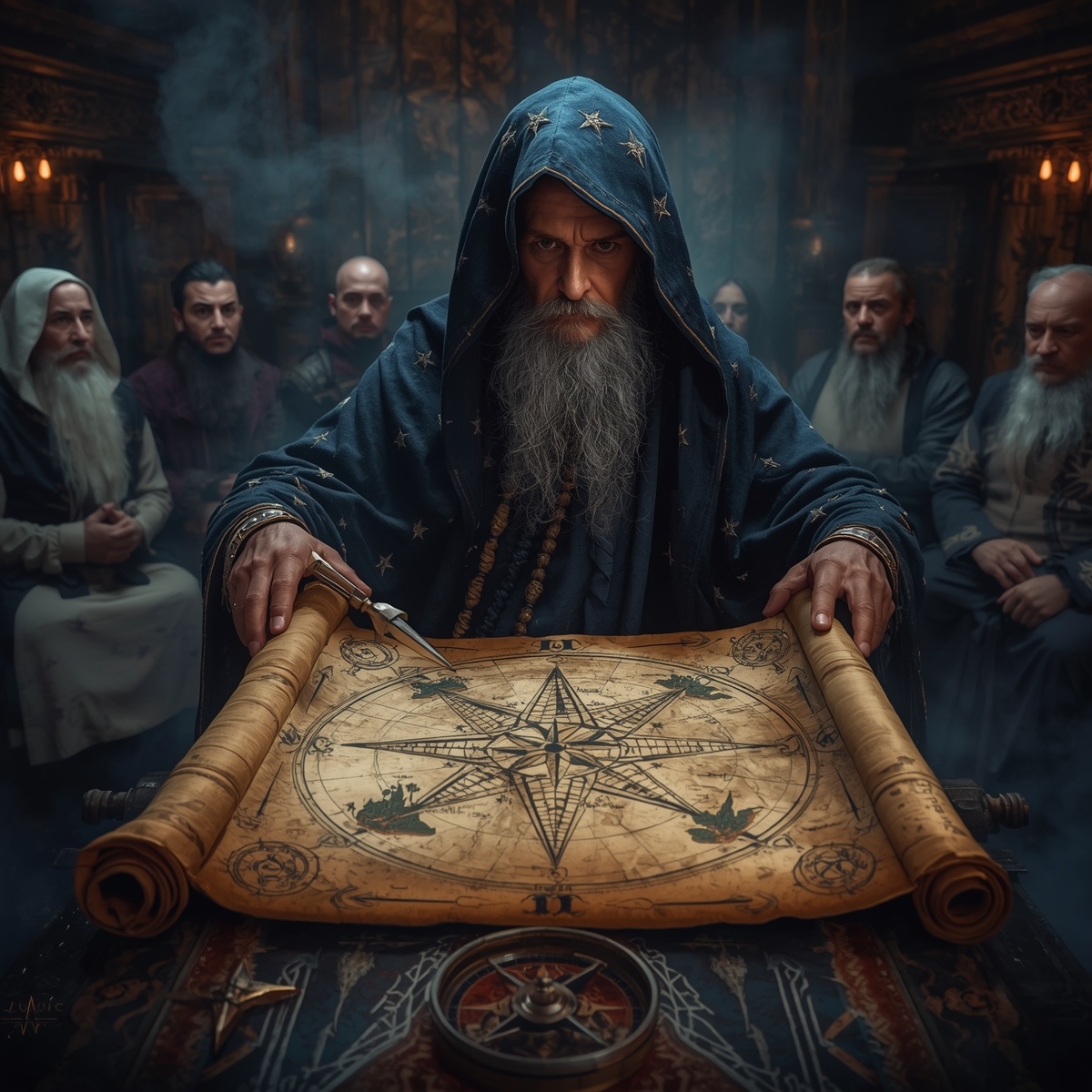 С палубы сошёл пожилой мужчина в тёмно-синем плаще, расшитом созвездиями. Его глаза были цвета глубокого океана, а в руках он нёс кожаный свиток, явно очень древний.