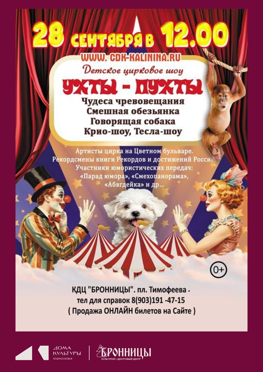 28 сентября 12:00 в МУК КДЦ "Бронницы" Волшебное шоу "Ухты-Пухты" для детей и родителей! Цена билета: 800-1400 рублей. Билеты в кассе КДЦ и онлайн по ссылке: https://iframeab-pre4796.intickets.ru/seance/62695908/ 🎤 Уникальный номер !!!🐶 Говорящая собачка Джеки (артисты разговаривают, не открывая рта! Это называется чревовещание - очень редкое искусство) 🤡 Весёлые клоуны и озорная обезьянка ⚡ Шоу с молниями - красиво и не страшно! (Тесла Шоу) ❄ Ледяное волшебство - удивительные эксперименты со азотом (Крио Шоу) Супер зрелищно! Ещё и очень познавательно! Наши артисты - настоящие звёзды: 🌟 Они выступали в программах "Аншлаг", "Смехопанорама" и других известных шоу 🎪 Работали в цирке Никулина и театре Дуровой 🌍 Гастролировали по разным странам мира Можно будет: - Поиграть с артистами - Стать участником представления Будет очень весело и интересно не только детям, но и... Подробнее: vk.com/wall-23847572_420398