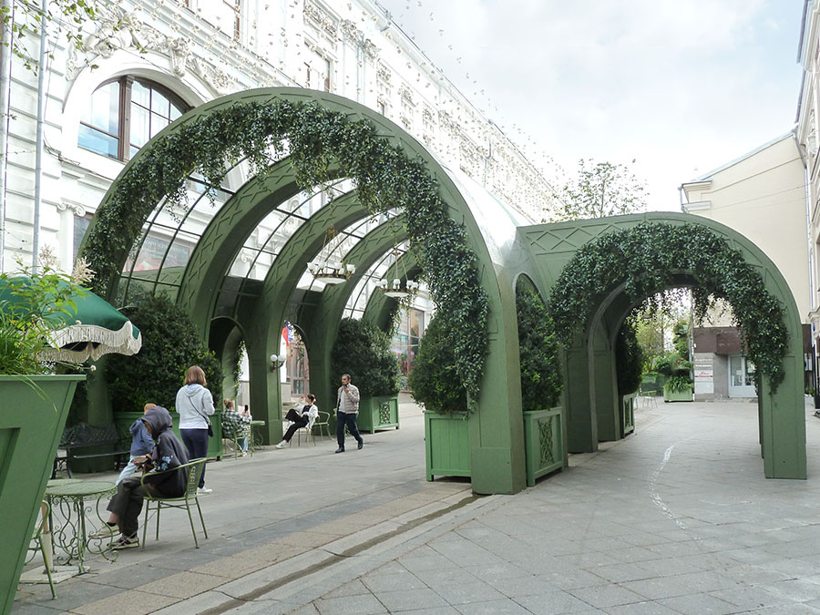 Улица Кузнецкий Мост в начале летнего сезона превратилась в настоящую смотровую площадку ландшафтного искусства. Здесь раскинулся многоуров-невый сад, а вокруг высадили липы с фигурной кроной. Эти деревья были под-стрижены в виде шпалер и крыш, благодаря чему появился эффект сказочного городка в зелени. Липа — символ мира и долголетия, а ее нежный аромат наполнял пространство особой атмосферой уюта и спокойствия